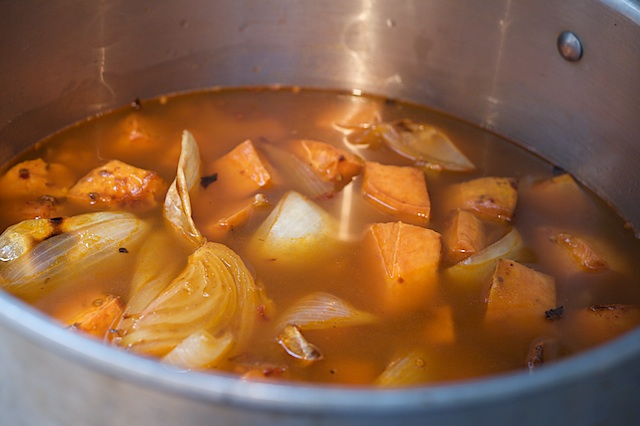 - Put the roasted vegetables into a large saucepan. Add 6 cups of the vegetable broth and bring to a simmer over medium heat. Reduce heat to low and simmer for 20 minutes. Puree the soup using an immersion blender, or in batches in a normal blender. Be careful if blending hot soup in the blender--do so in small batches and hold the top on with a kitchen towel to avoid an eruption. Add the remaining 2 cups of broth as needed to thin out the soup. Season to taste with kosher salt, black pepper, and an additional tablespoon of honey if desired.